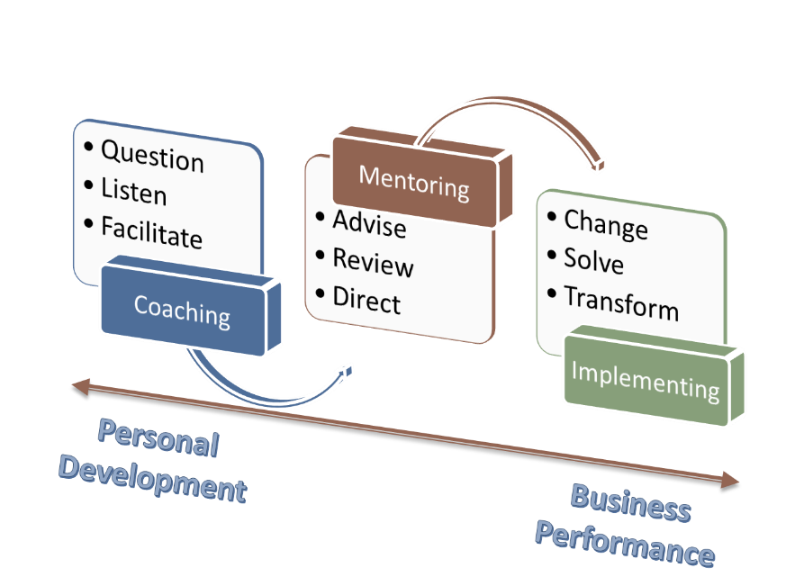 We can switch between guiding with coaching, advising with mentoring and implementing a solution, whichever is most comfortable for you.